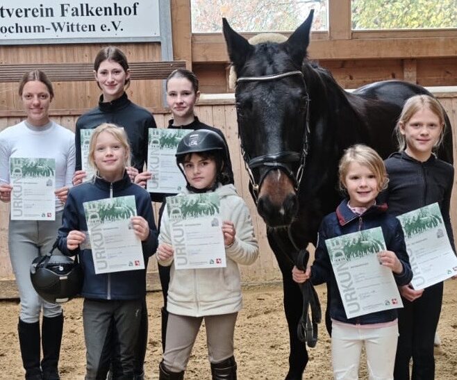 Auf dem Falkenhof in Bommerholz fand eine Reitabzeichenprüfung statt. Die sieben engagierten Prüflinge, die von der Pferdewirtschaftsmeisterin Annemarie Lagemann auf ihren großen Tag in einem Lehrgang vorbereitet wurden, konnten alle die Prüfung bestens bestehen.